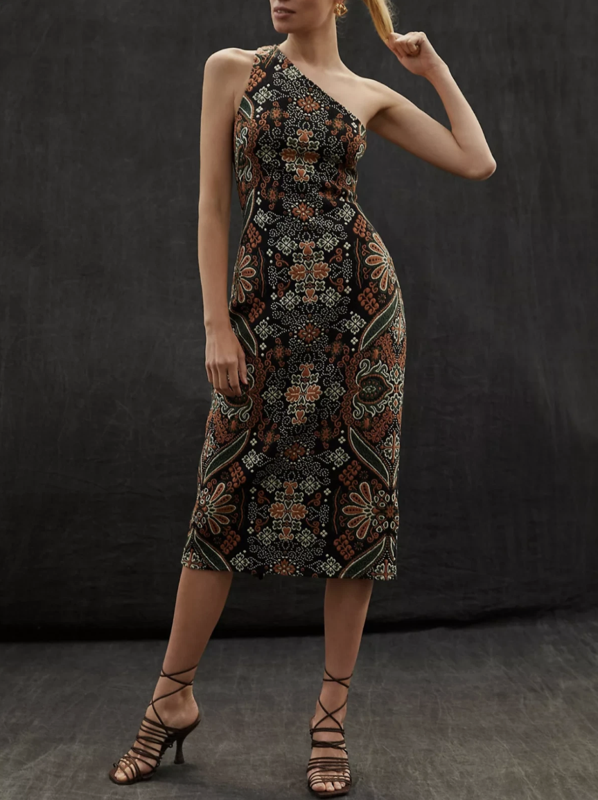 Anthropologie Black One Shoulder Jacquard Midi Dress