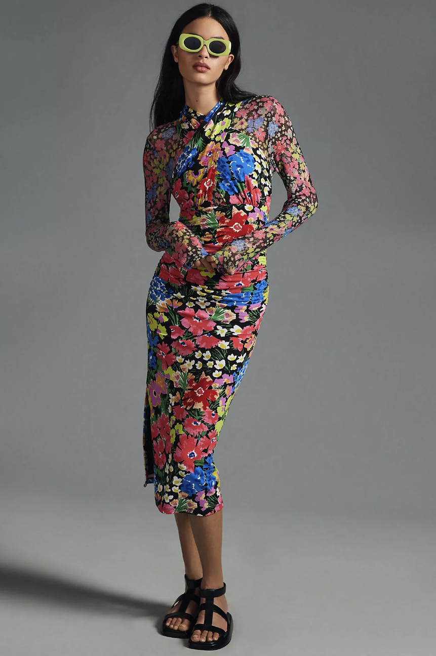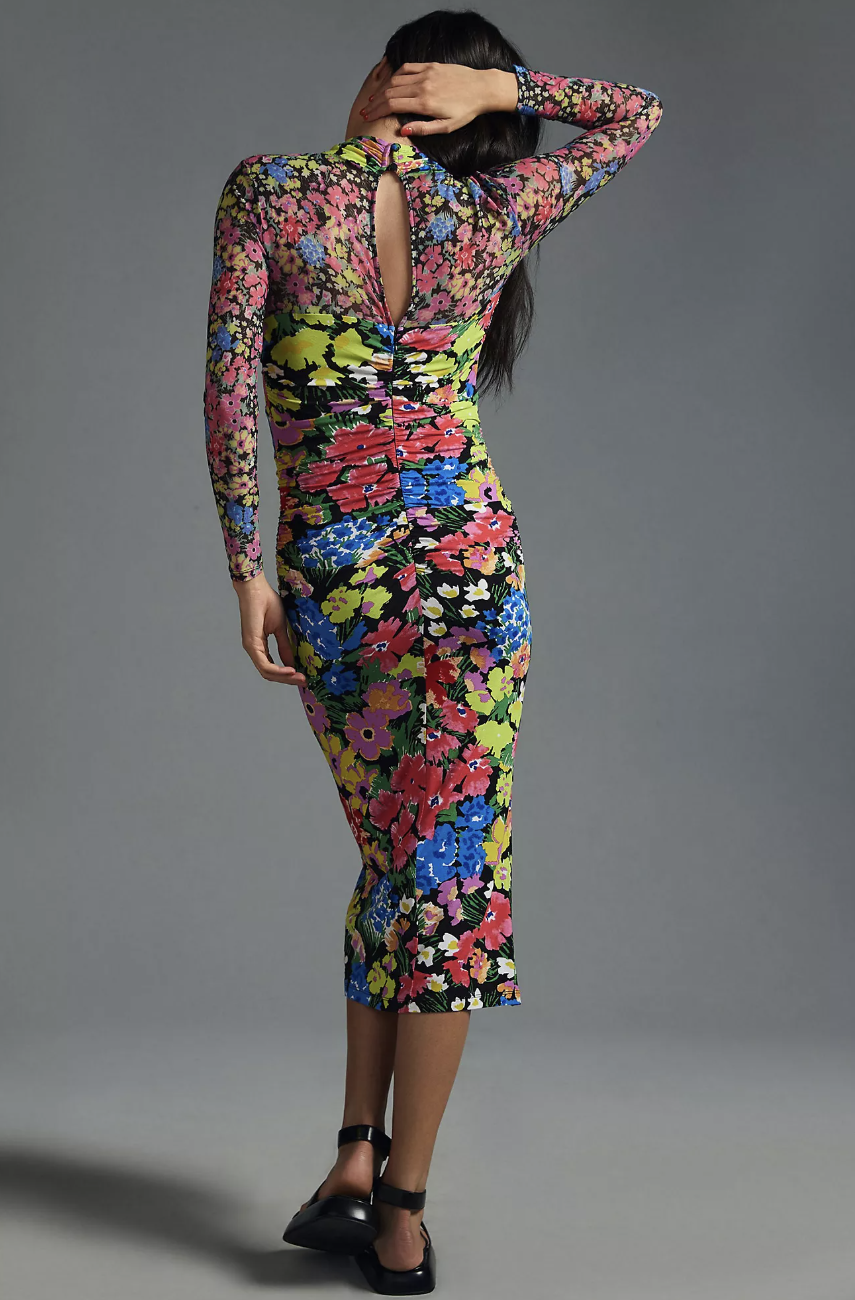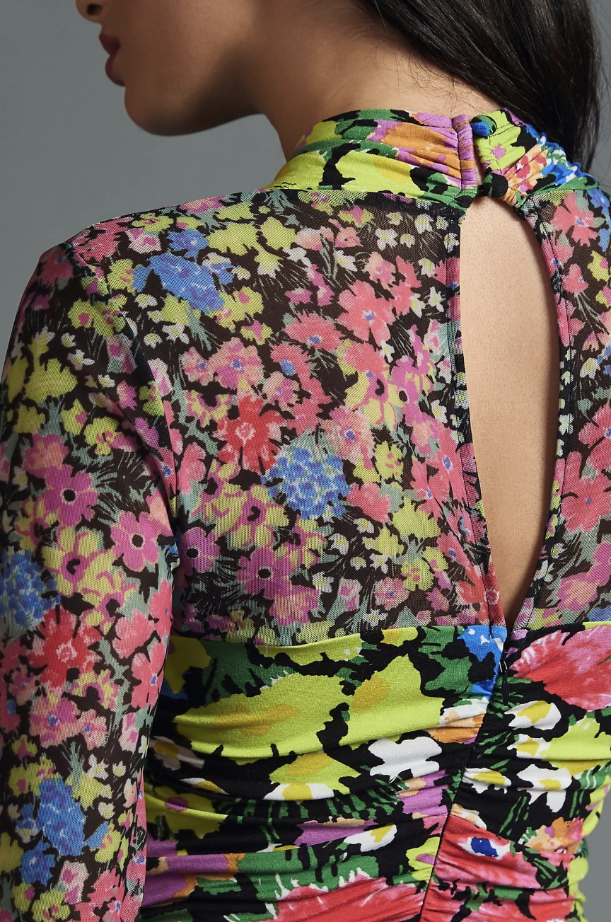 Anthropologie Floral Multicolor Mesh Halter Mock-Neck Dress