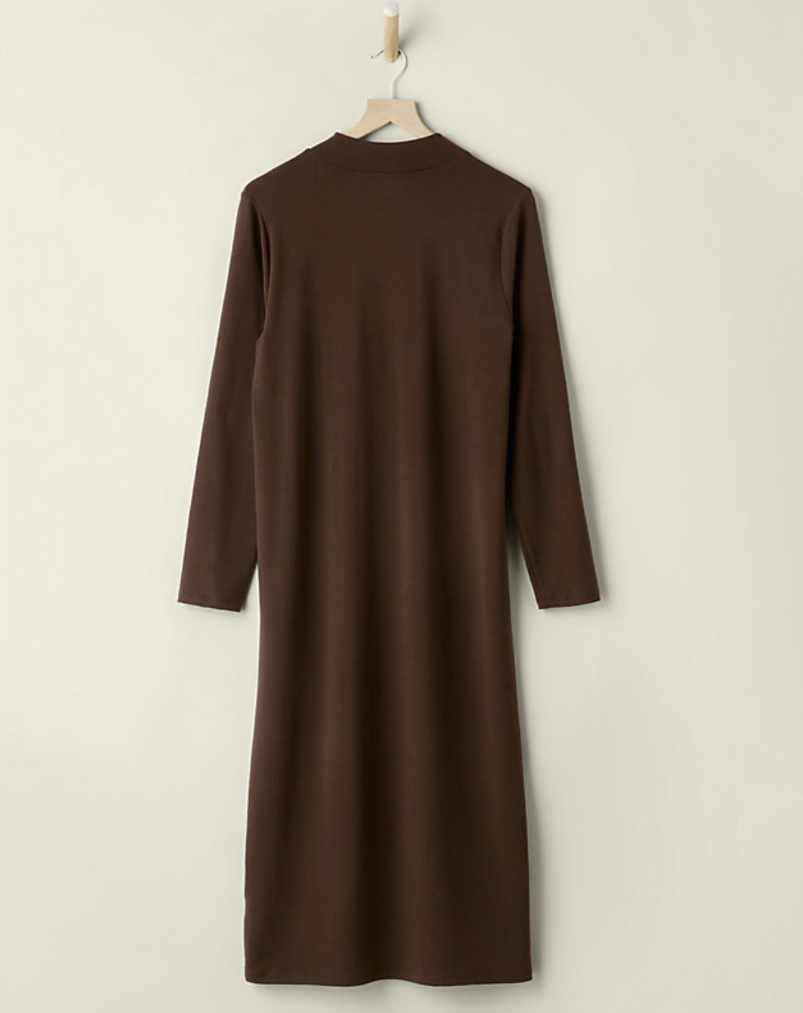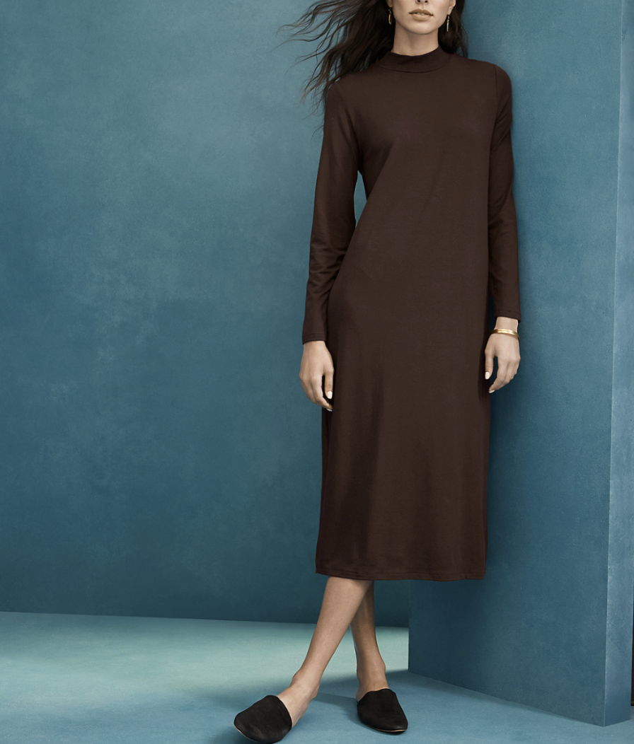 Eileen Fisher Brown Fine Jersey Mock Neck Long Sleeve Midi Dress
