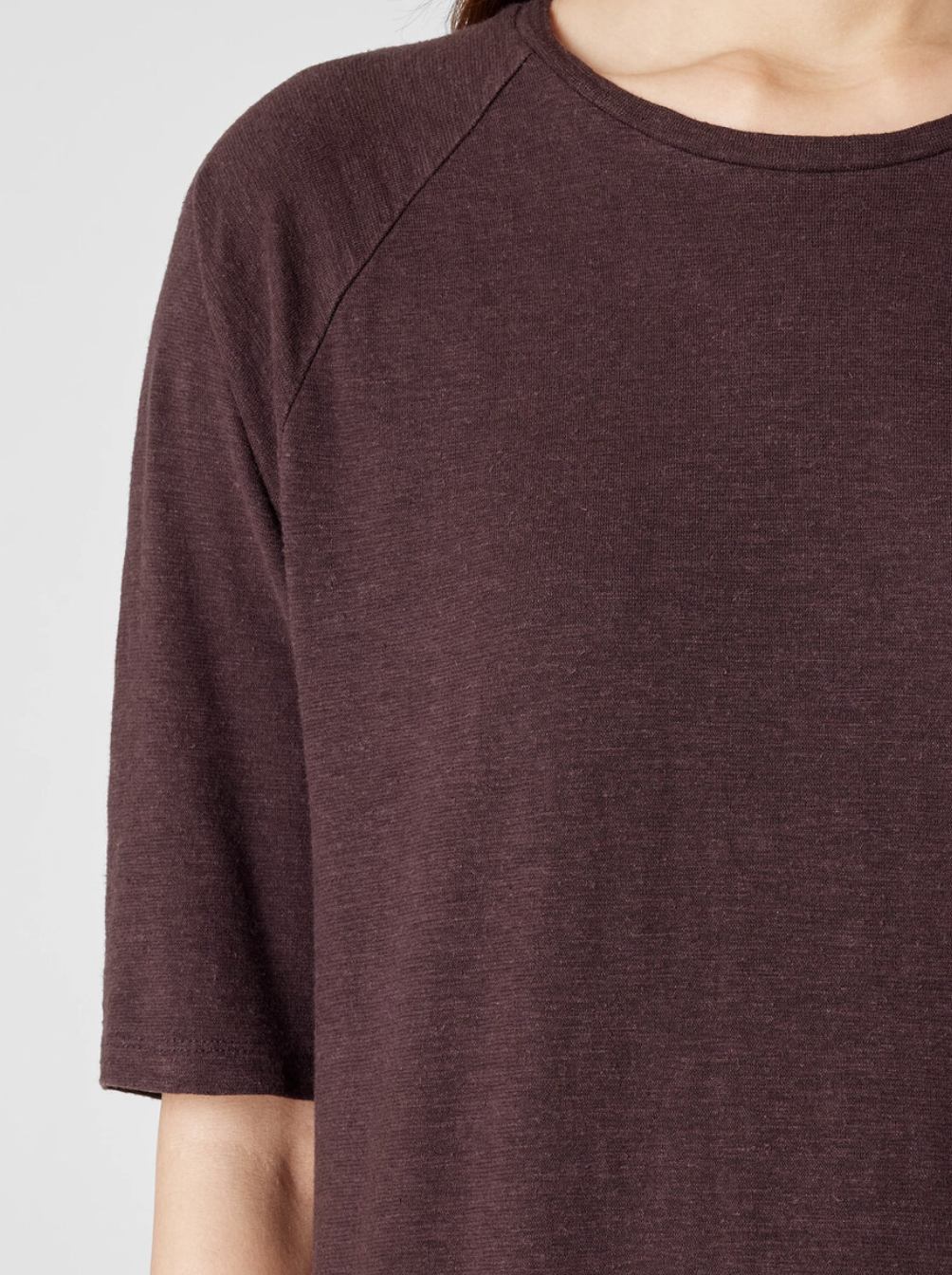 Crew neck, raglan elbow sleeves.