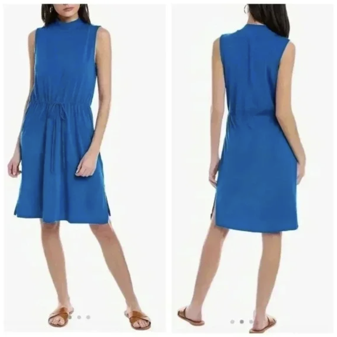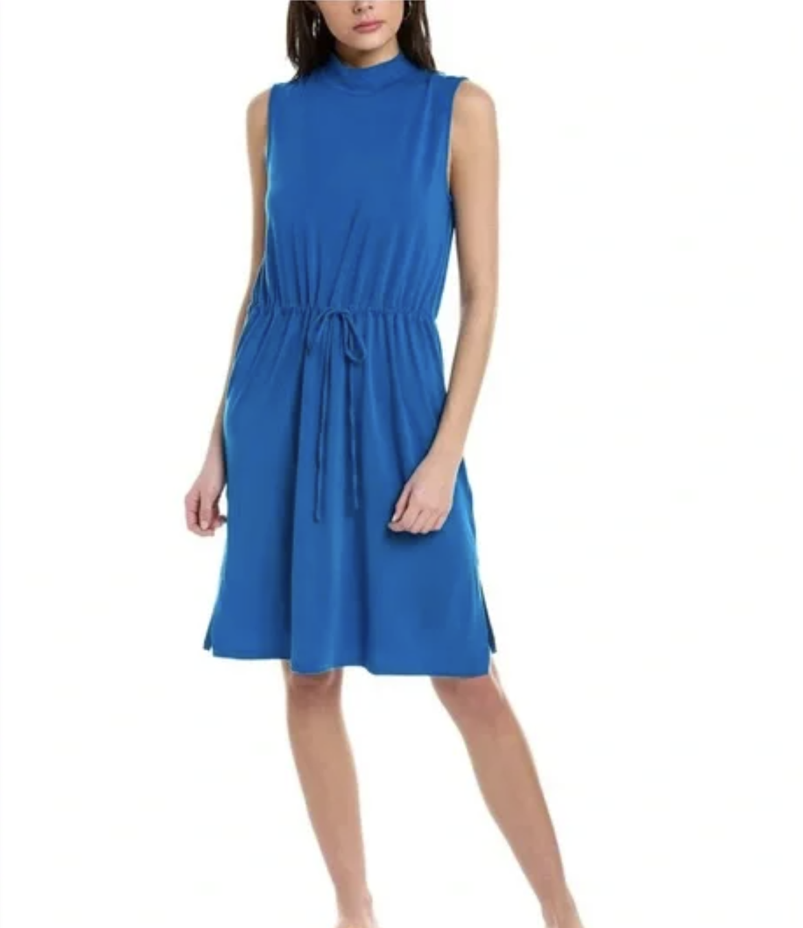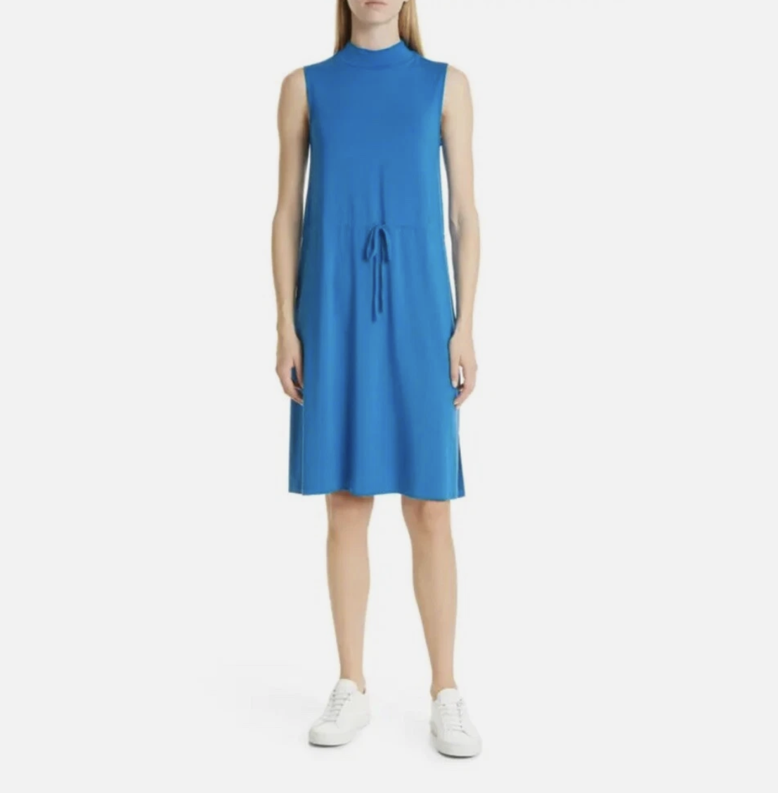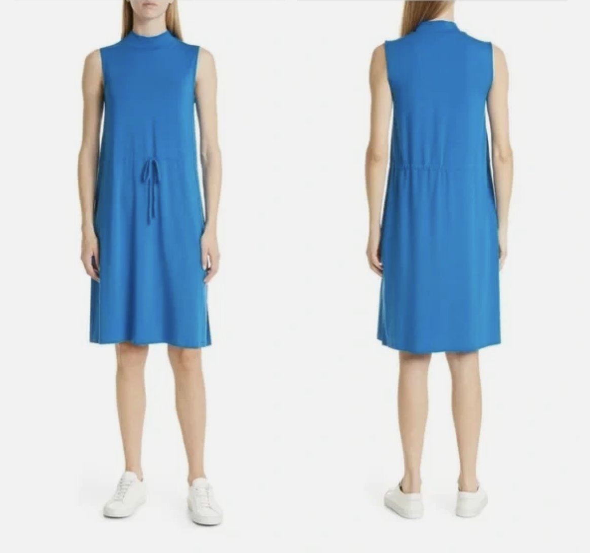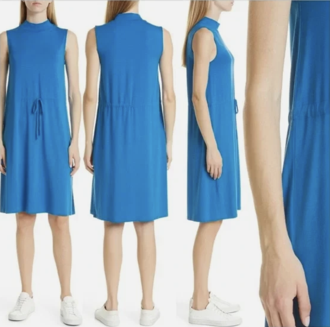Eileen Fisher Marine Blue Jersey Drawstring Waist Mock Neck Dress