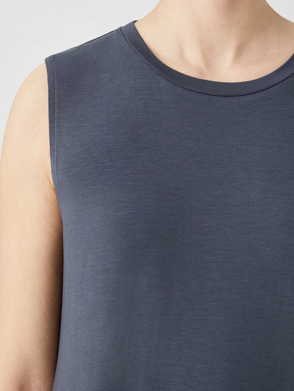 Crew neck, sleeveless. Finely finished with banding at the neck.