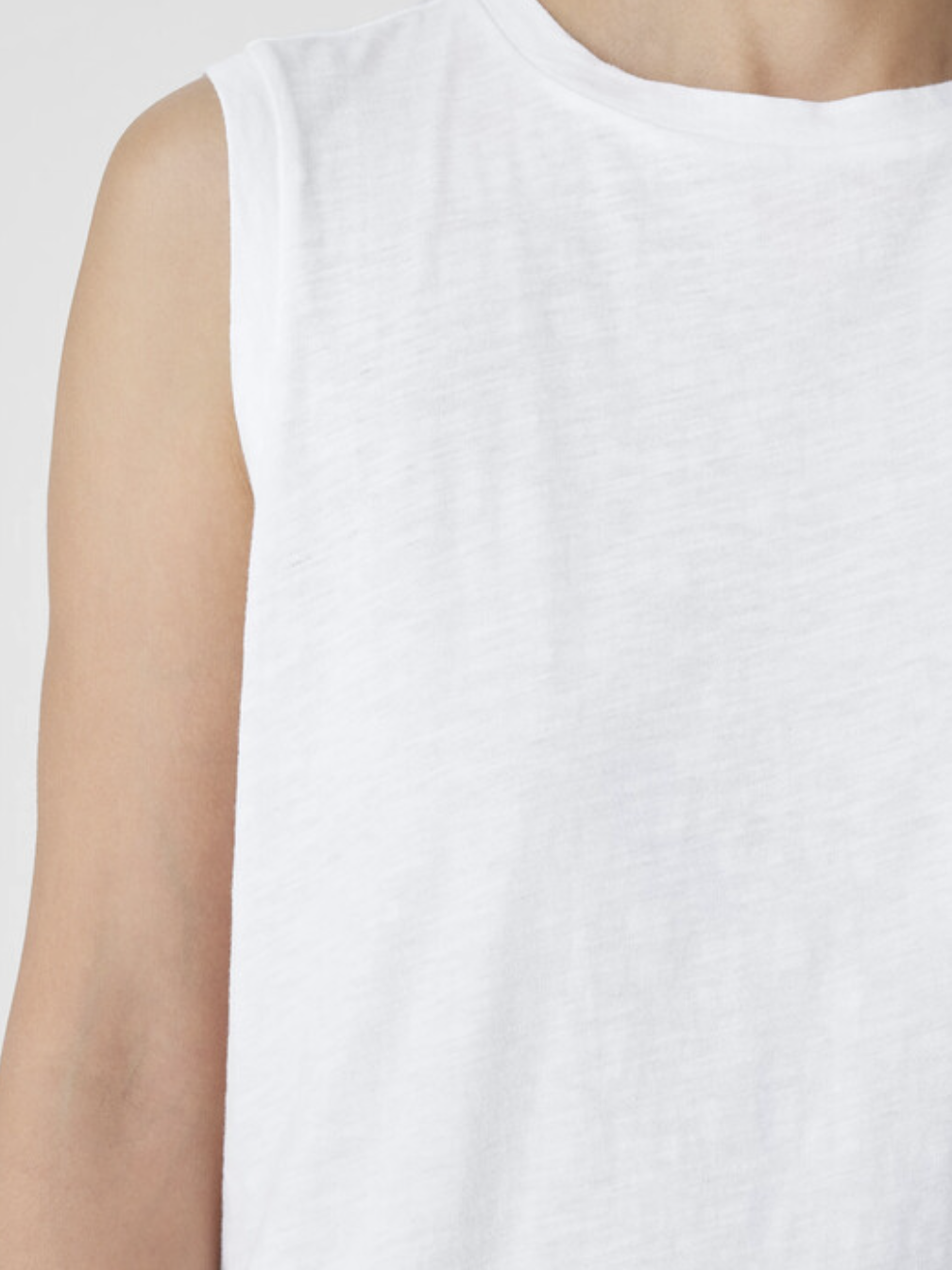 An easy warm-weather staple. Our crew neck tank with a stepped hem and side slits. In organic cotton jersey with refined texture.