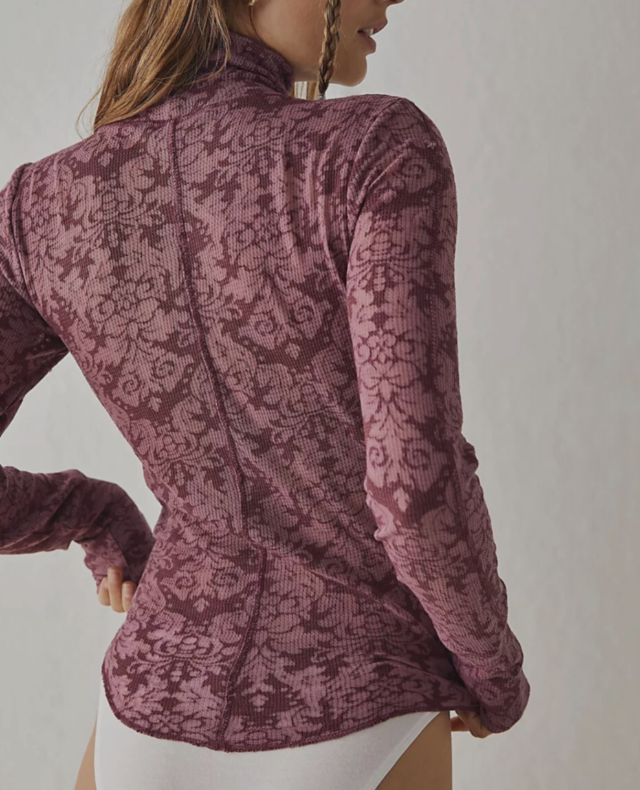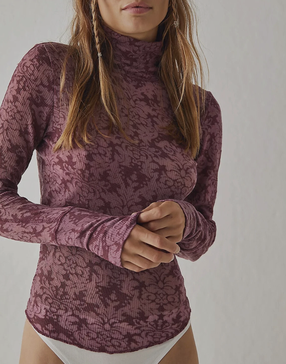 So cozy, thermal-inspired long sleeve featured in a printed fabrication and lightweight design with a turtle neckline.