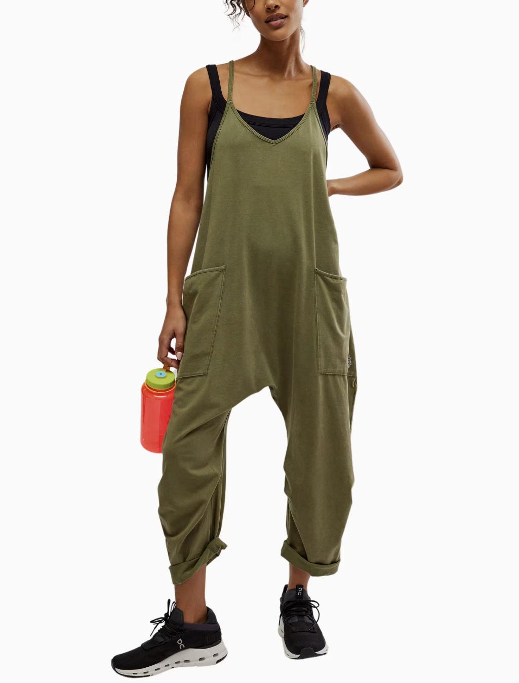 This soft and comfy onesie features a slouchy, relaxed-fitting design with a dropped crotch and convenient side pockets.