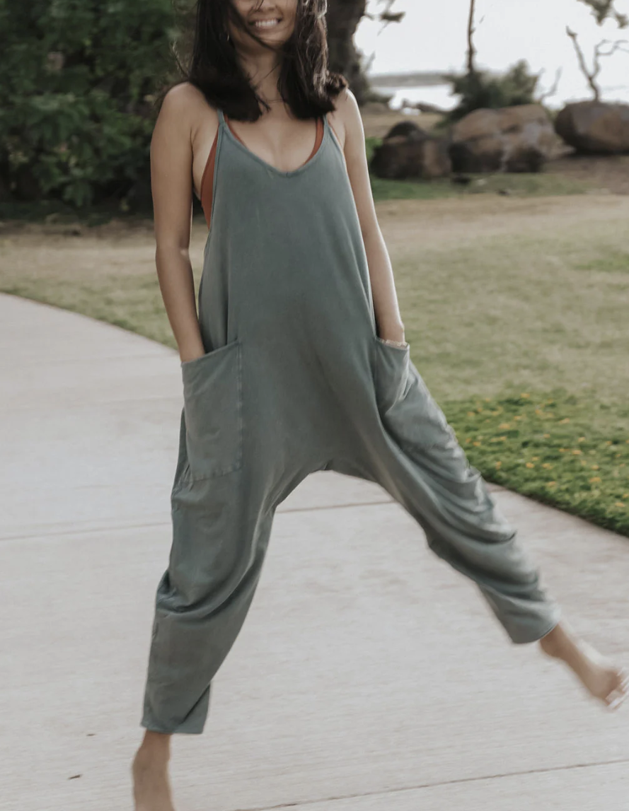 This soft and comfy onesie features a slouchy, relaxed-fitting design with a dropped crotch and convenient side pockets.