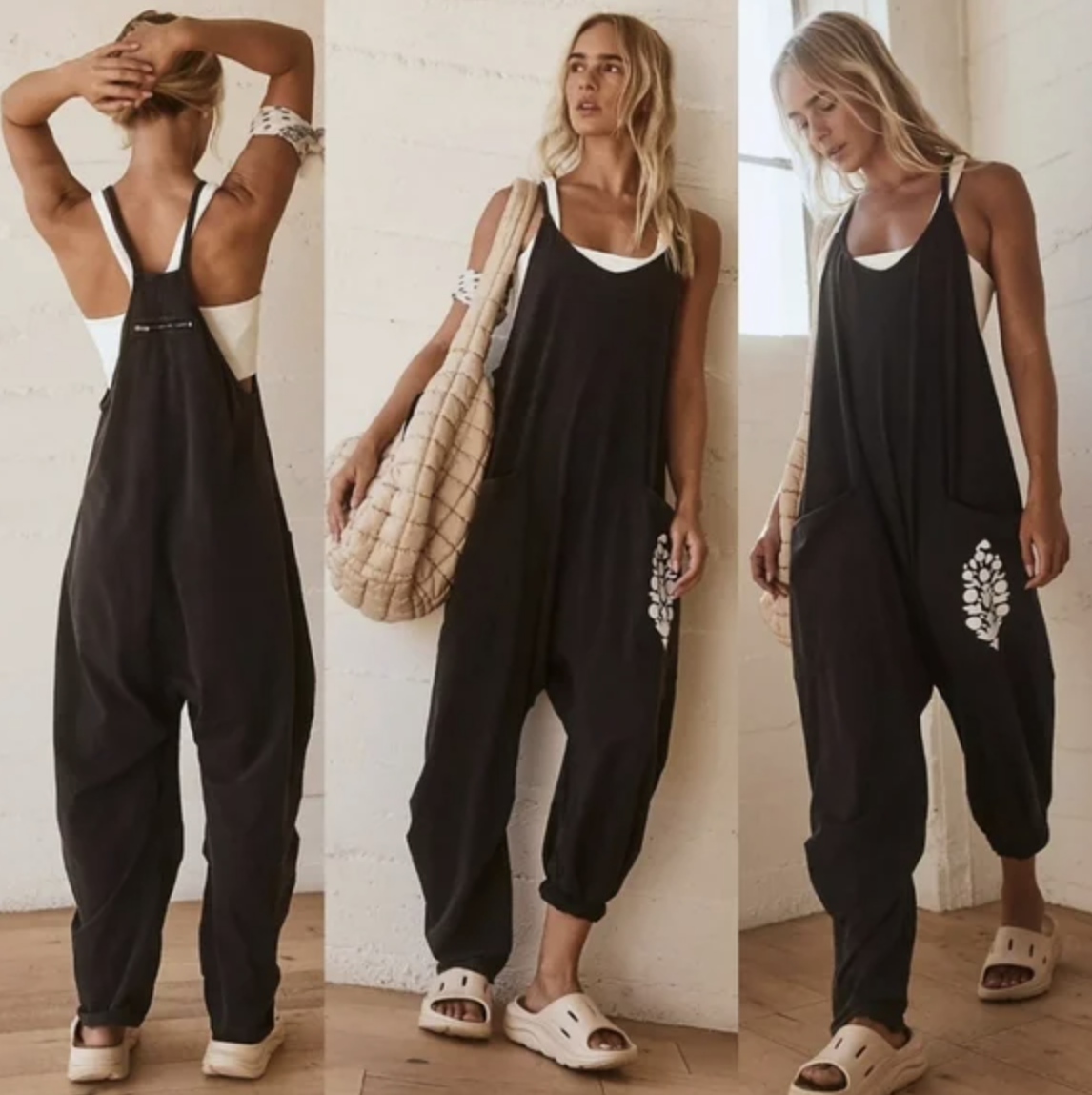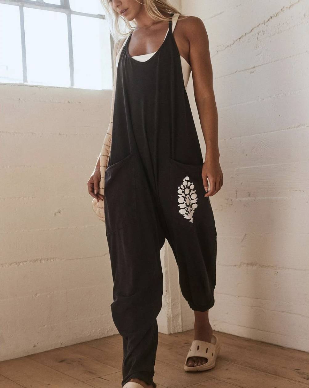 This soft and comfy onesie features a slouchy, relaxed-fitting design with a dropped crotch and convenient side pockets.