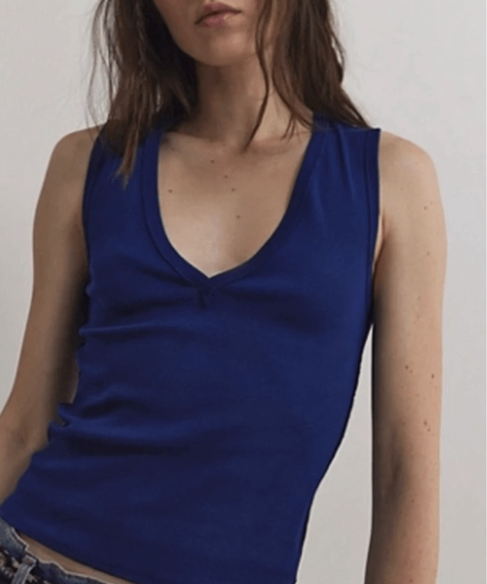 Free People We The Free Blue Sleeveless Ribbed Neria V-Neck Tank Top