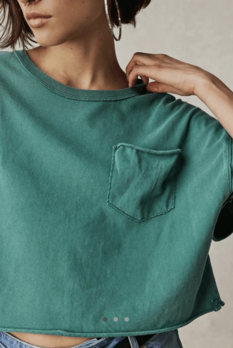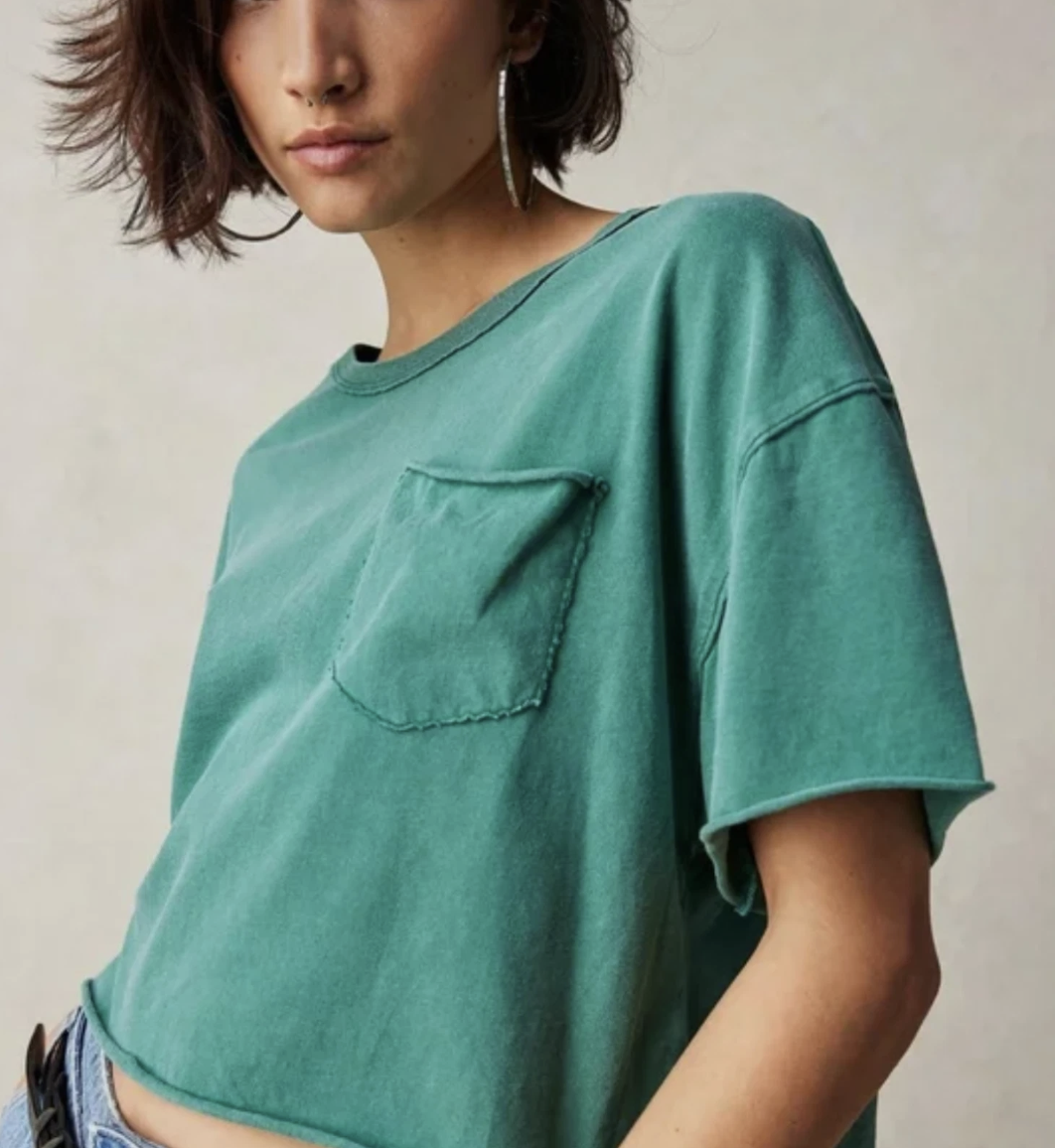 Take your tees collection to the next level with this effortlessly essential version featured in a boxy, cropped fit with dropped shoulders, raw bottom hem, and slightly distressed front patch pocket for a true lived-in look.