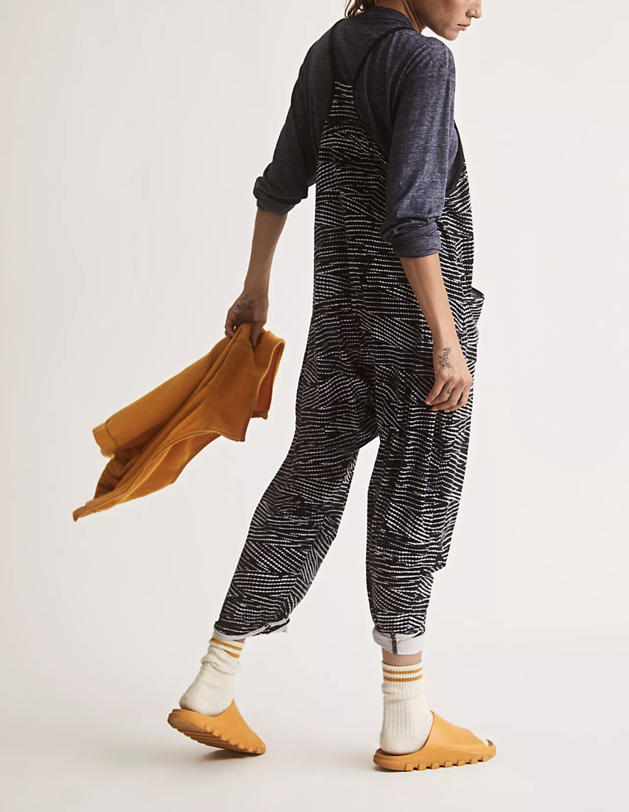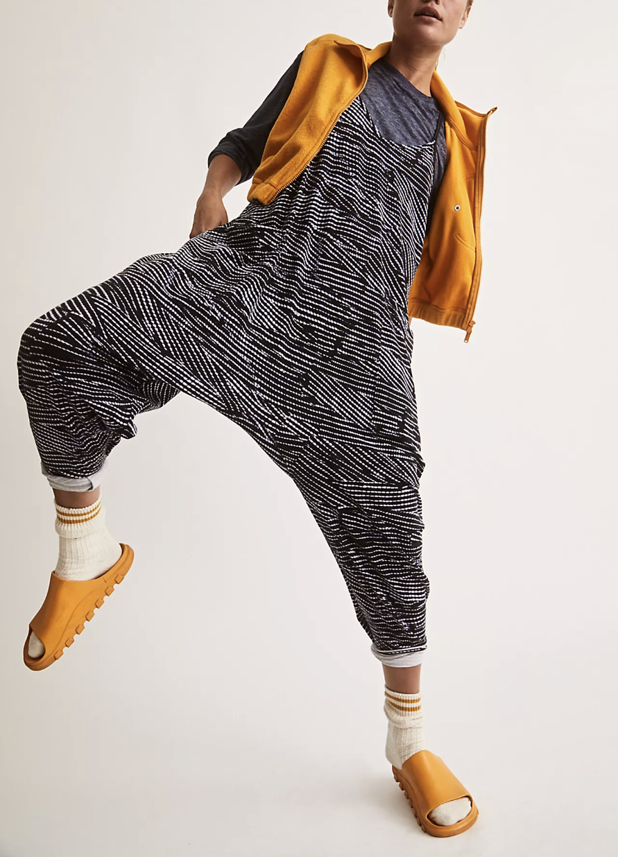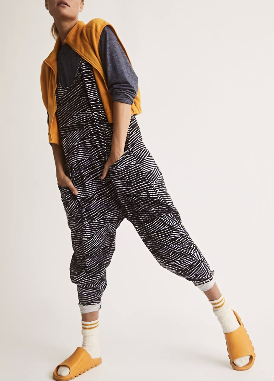 This soft and comfy onesie features a slouchy, relaxed-fitting design with a dropped crotch and convenient side pockets.