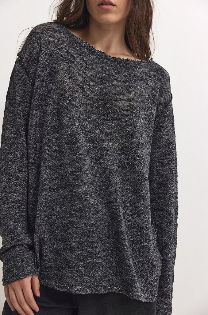 Features: Lightweight, semi-sheer knit fabrication, boat neckline, drop-shoulder long sleeves, raw trims