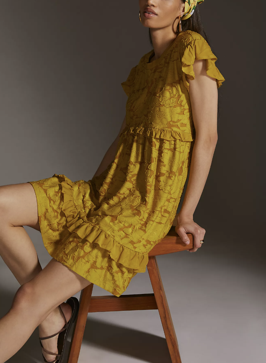 Anthropologie Yellow Short Sleeve Ruffle Knit Mini Lined Dress