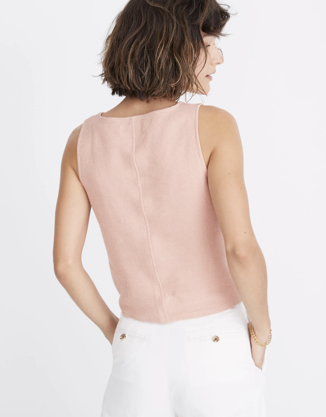 Take this button-front tank, for instance: Crafted in ottoman jacquard, it has a flattering V-neck and a tie at the waist.