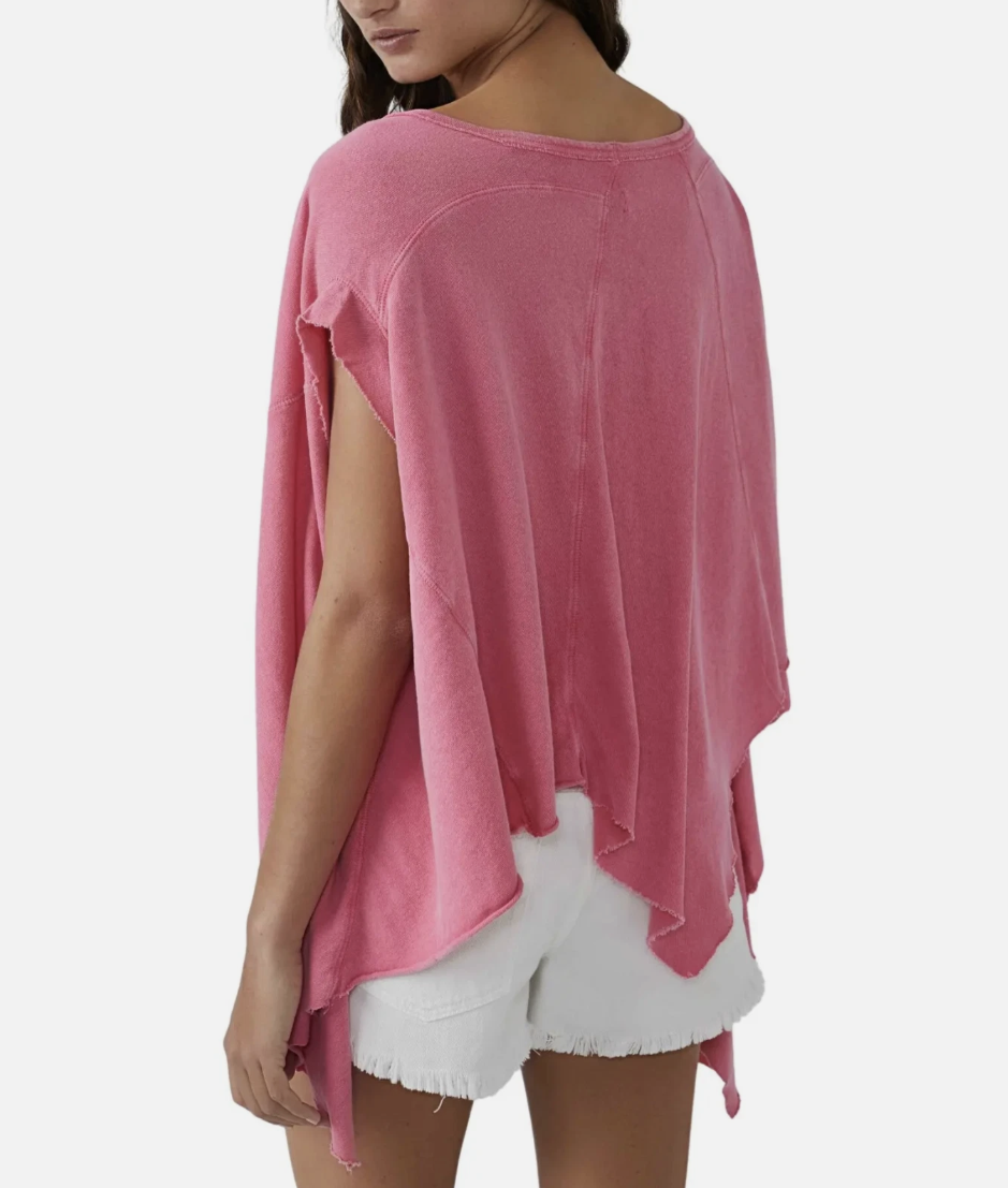 Features: Scoop neckline, distressing at hems, dropped sleeves, dropped sides