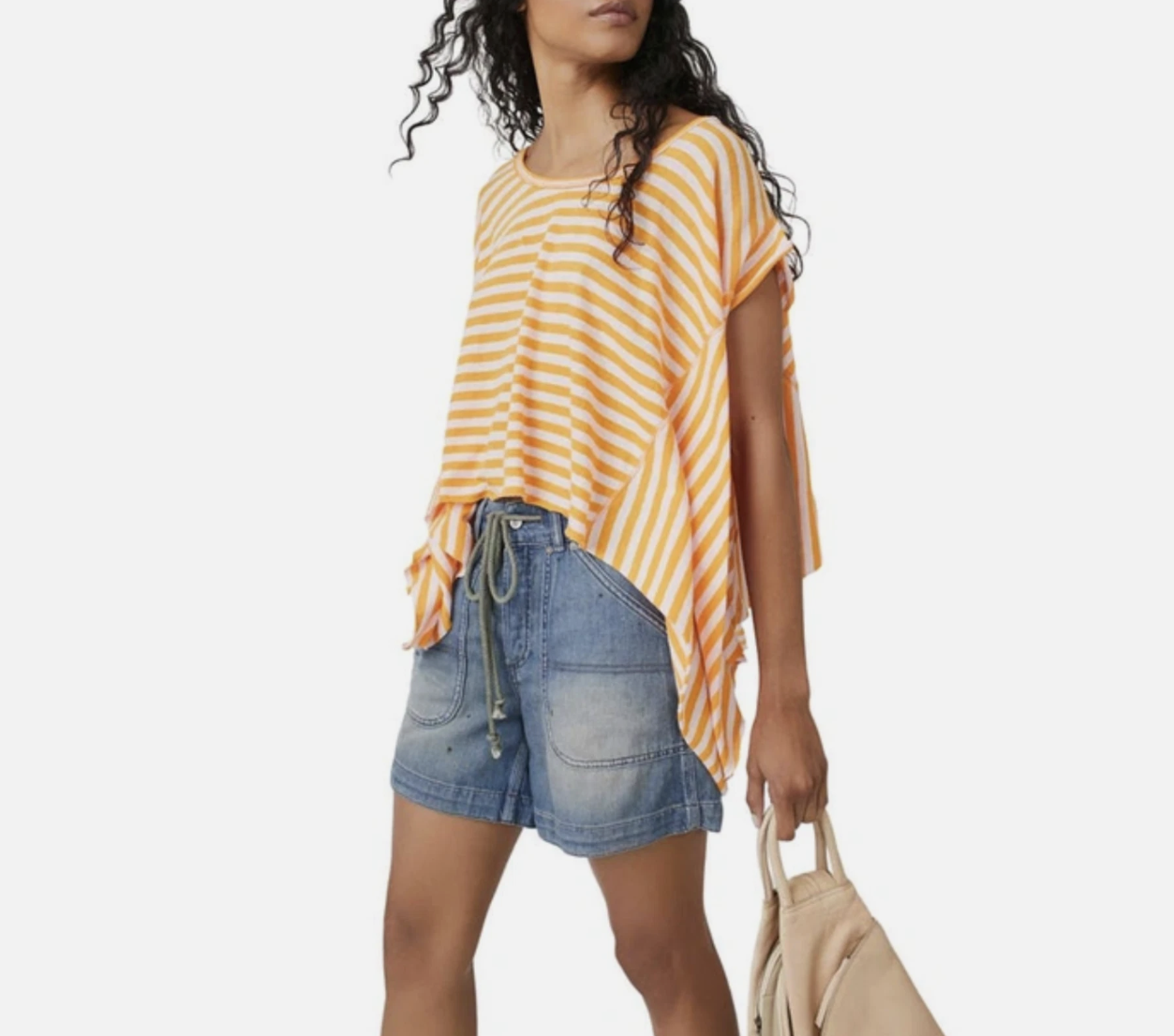 Features: Scoop neckline, distressing at hems, dropped sleeves, dropped sides