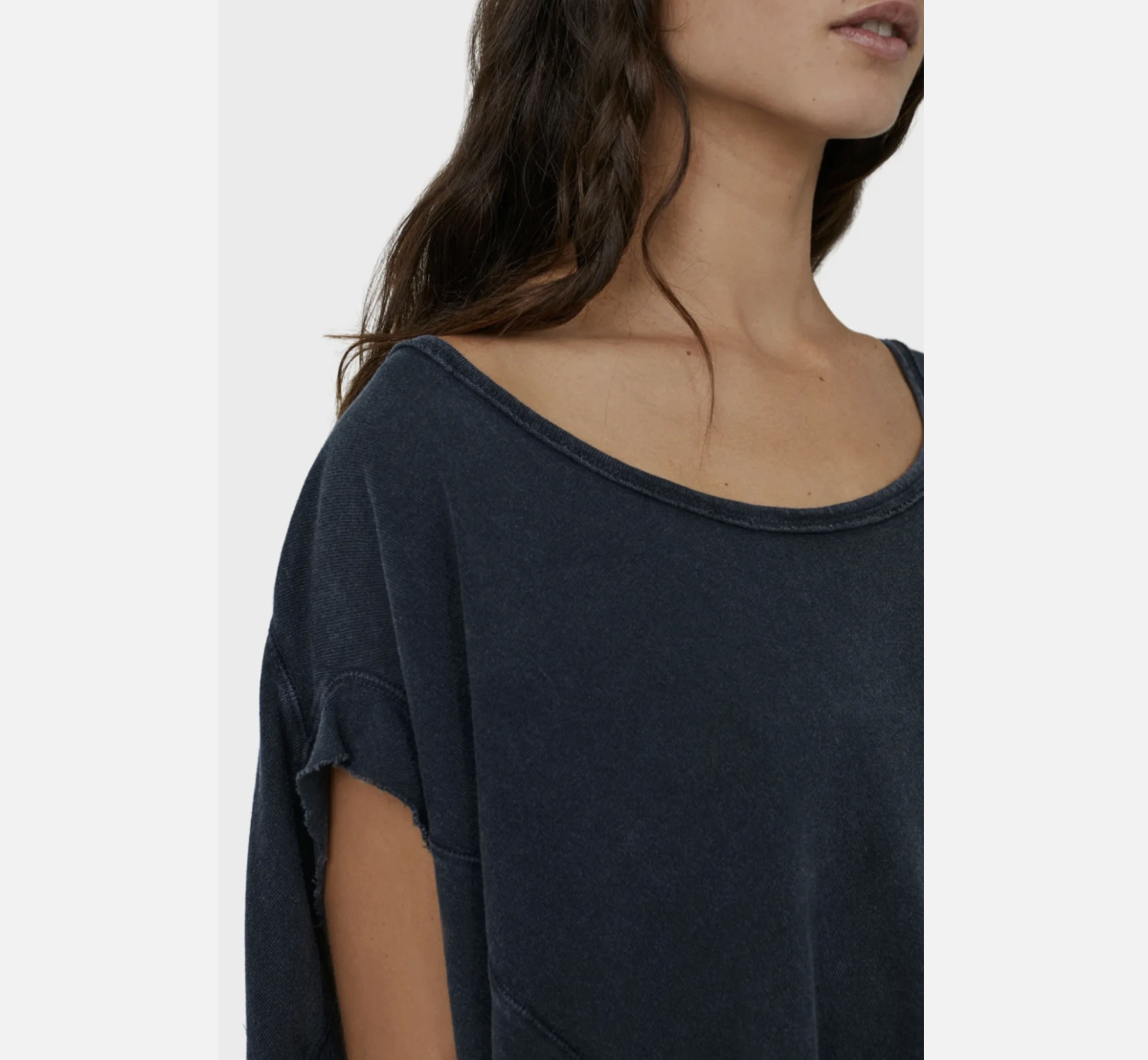 Features: Scoop neckline, distressing at hems, dropped sleeves, dropped sides