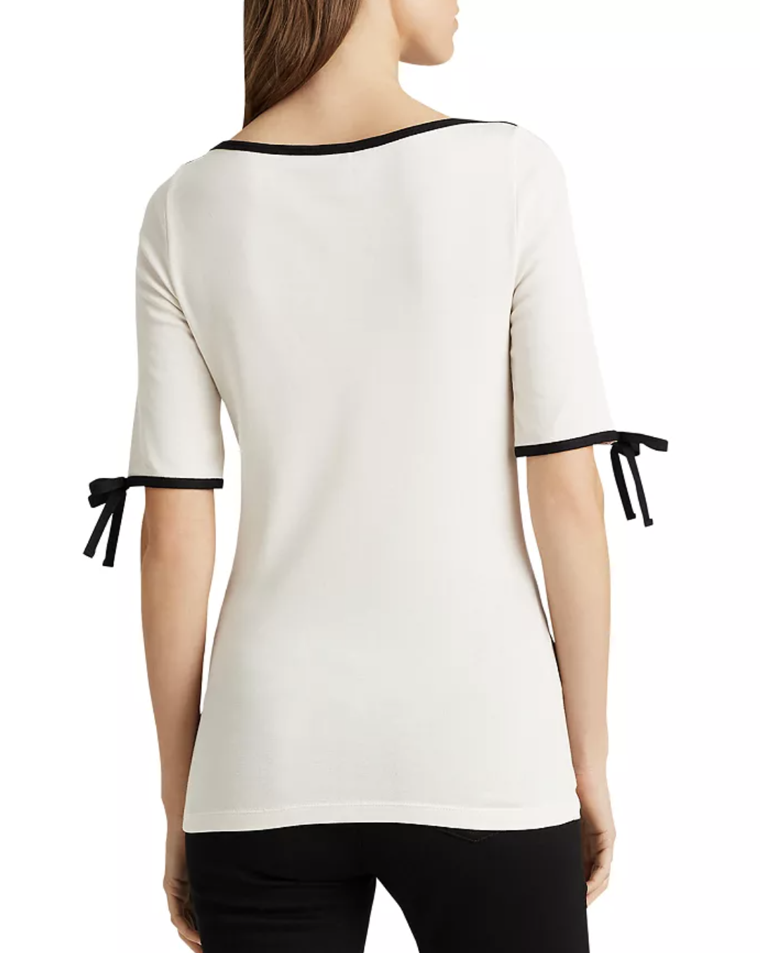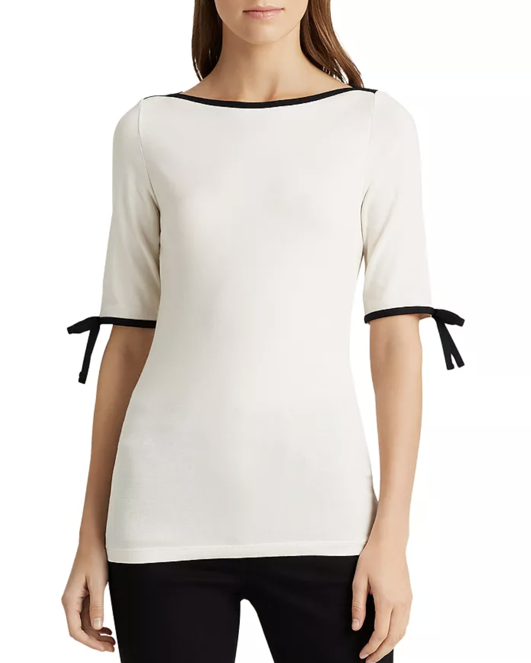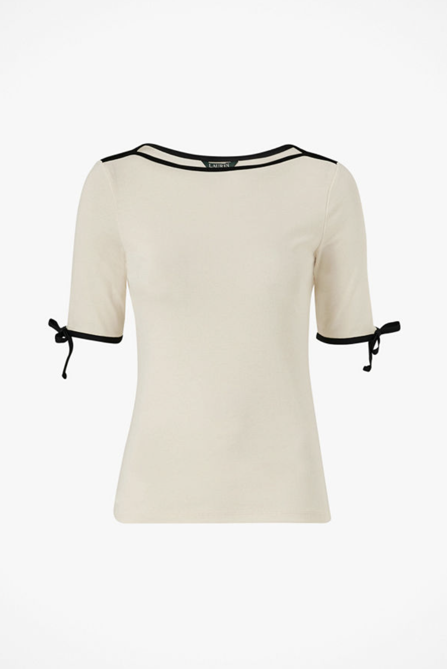 Lauren Ralph Lauren Ivory Black Boat Neck Contrast Trim Bow-Sleeve Top