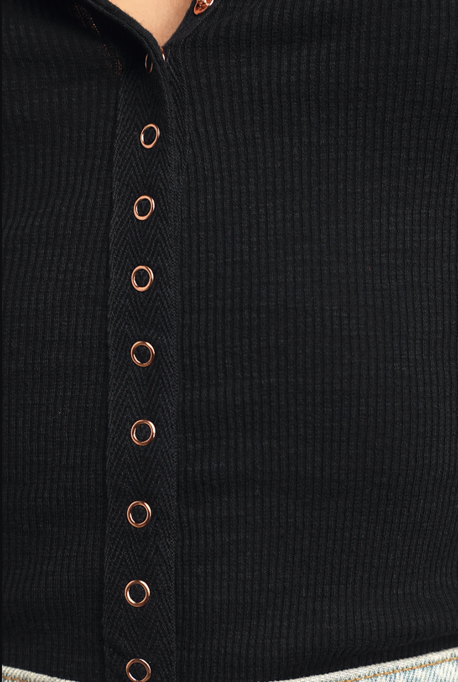The Free People Tellin' Me Black Ribbed Snap Front Tank Top is here to help you up your basics game! Stretchy ribbed knit, with a slight burnout effect, shapes this essential tank that falls from skinny straps into a scoop neckline and fitted bodice with copper snap buttons down the front. Lettuce-edge hem adds a flirty finishing touch!