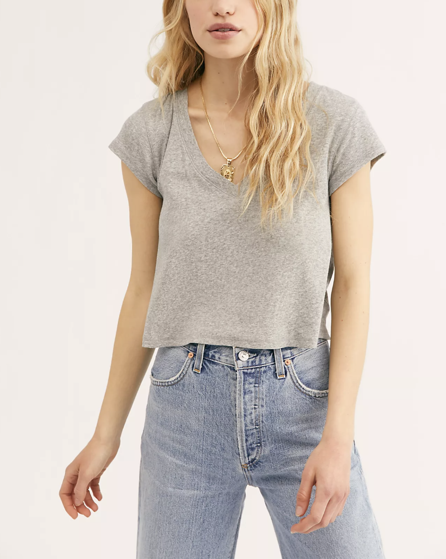 Free People Movement Heather Grey Short Sleeve Ribbed V-Neck Easy Tee Top