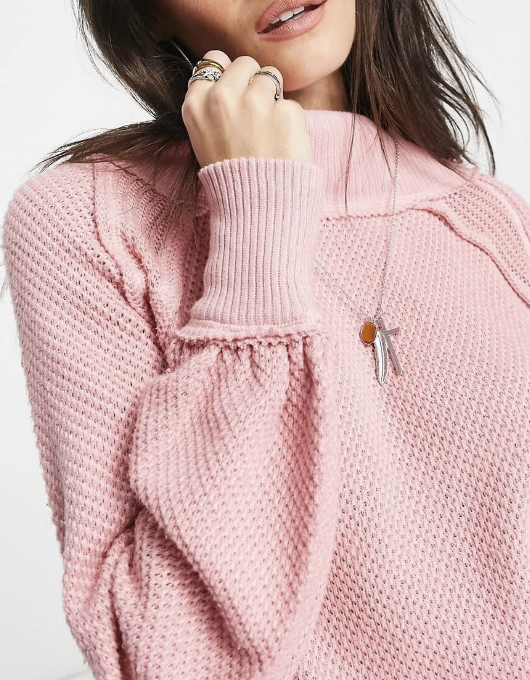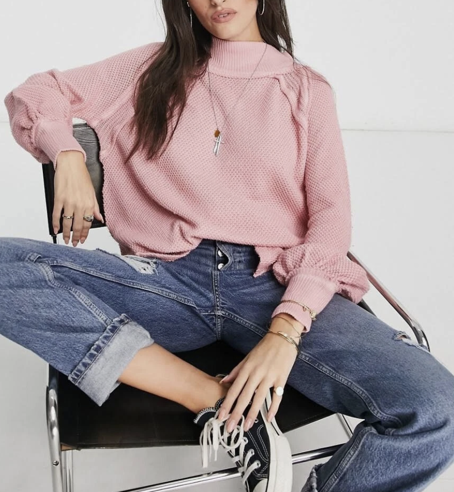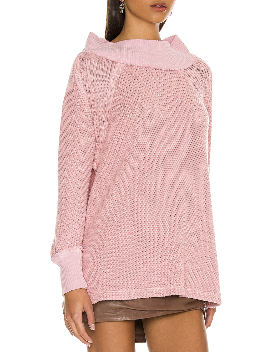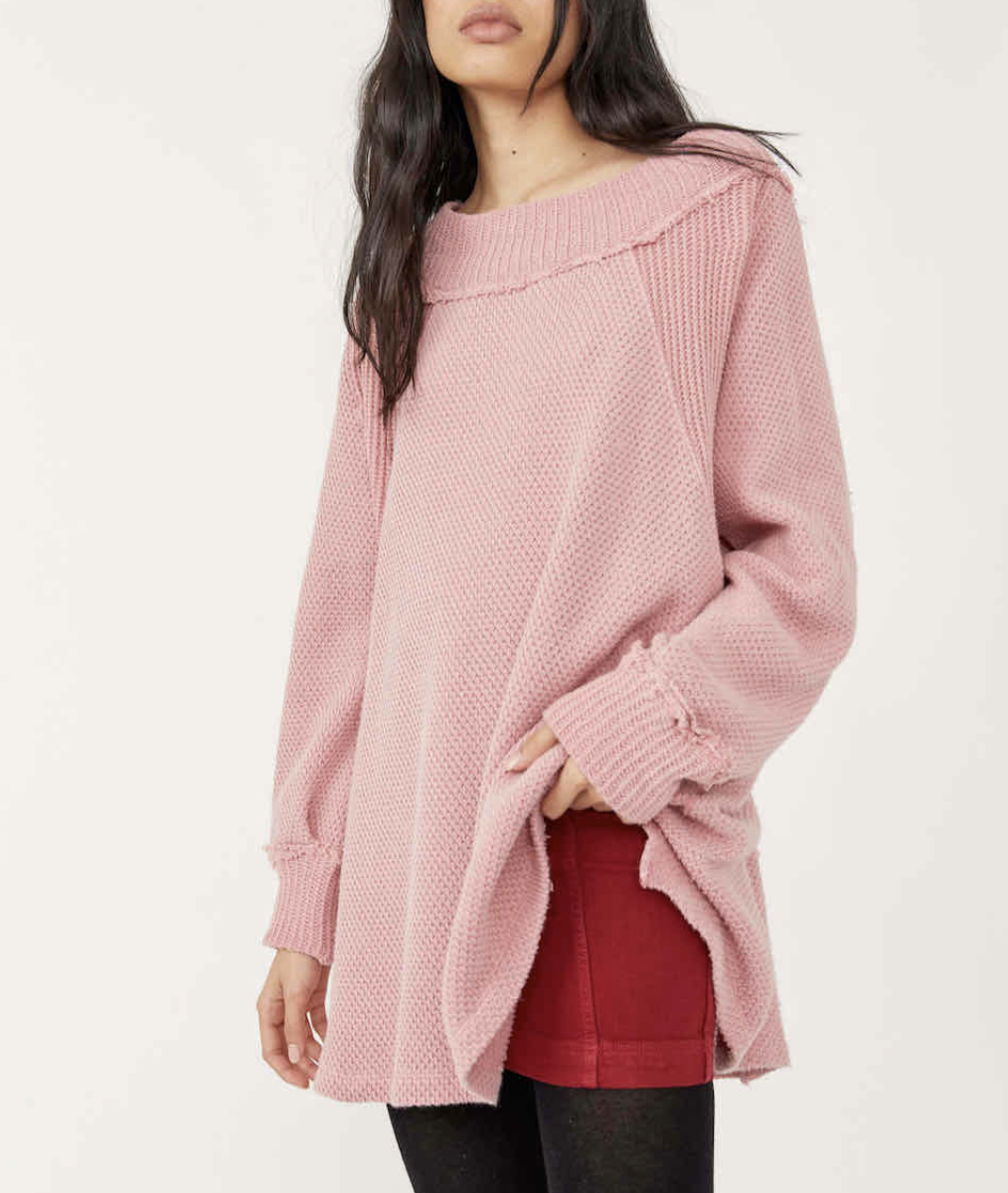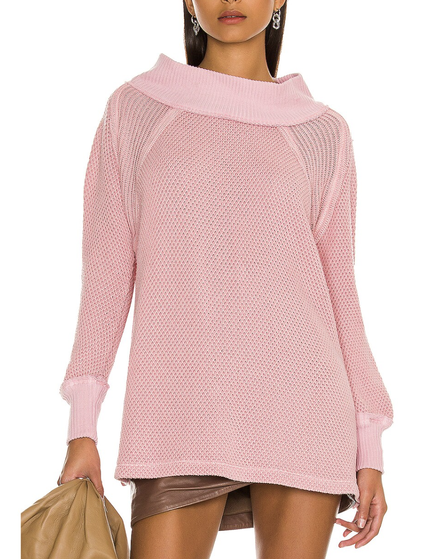 Free People “She’s a Keeper” – fabulous cotton-blend tunic sweater featuring an easy fit, mock neck, textured knits, ribbed neck and cuffs, side slits, medium weight fabric, slightly oversize fit. A very cool and cozy style, indeed!