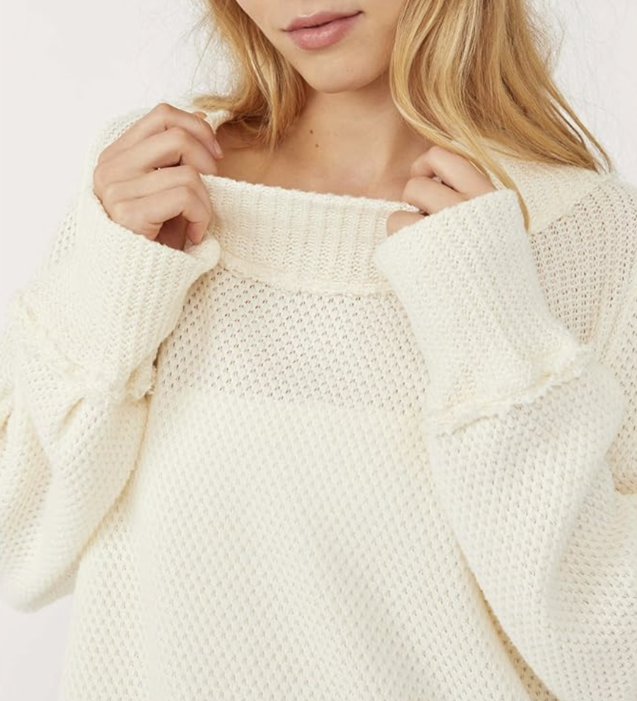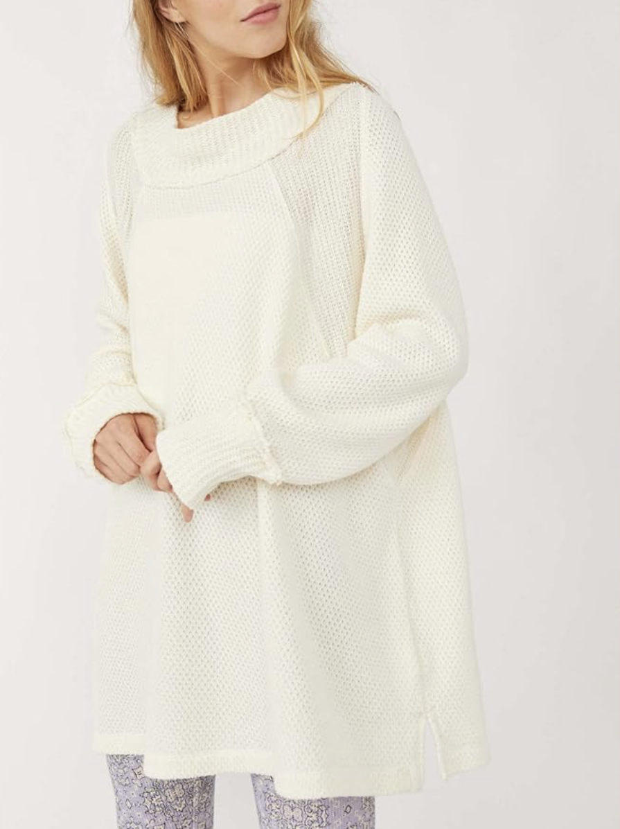 Free People “She’s a Keeper” – fabulous cotton-blend tunic sweater featuring an easy fit, mock neck, textured knits, ribbed neck and cuffs, side slits, medium weight fabric, slightly oversize fit. A very cool and cozy style, indeed!