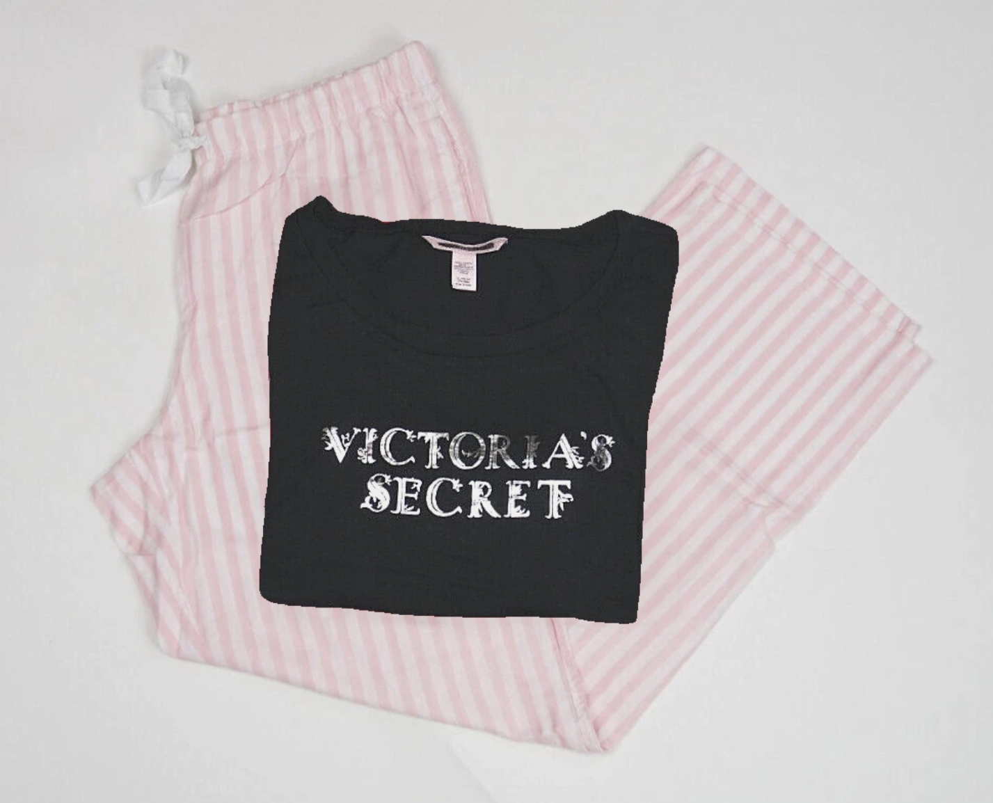 Victoria's Secret Black VS Long Sleeve & Pink/White Striped Pant - Pajama Set