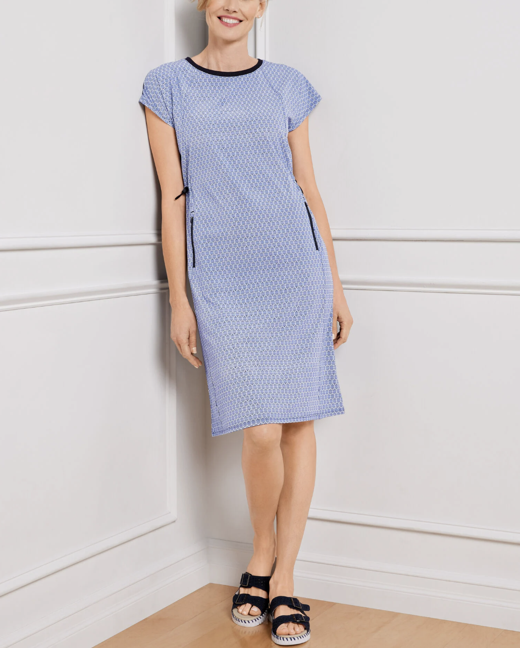 Our Lightweight Woven Stretch dress is a wear-anytime staple. Made with just-right stretch for ease of movement. In a pretty scallop print. Packable and wrinkle-resistant, with SunWell UPF 50+ protection. Detailed with zip front pockets for a sporty look and adjustable bungee cords at the waist for a flattering fit.